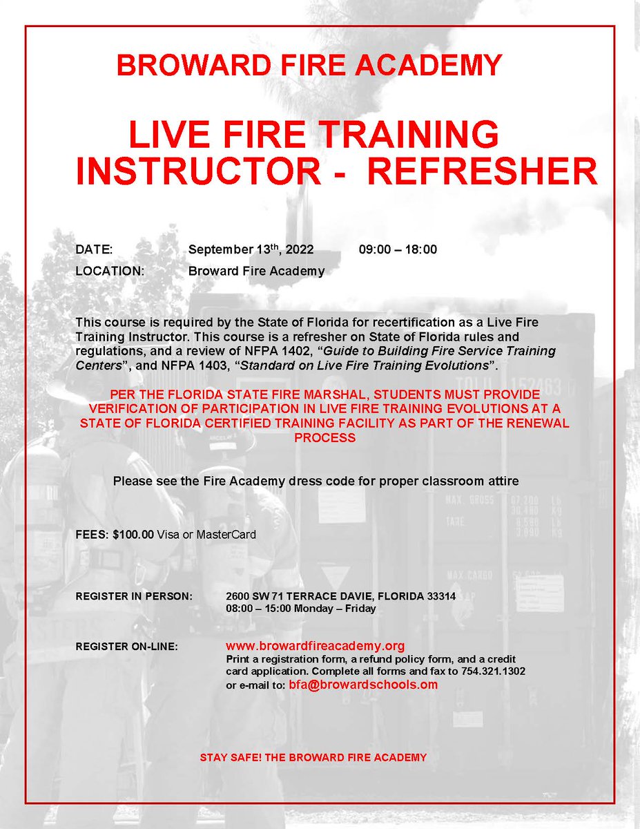 Our McFatter campus in Davie provides a 396-hour course that meets requirements set up by The Bureau of Fire Standards and Training State Fire Marshal Office. Fees are based on the number of class days. Ad Ranked by US.